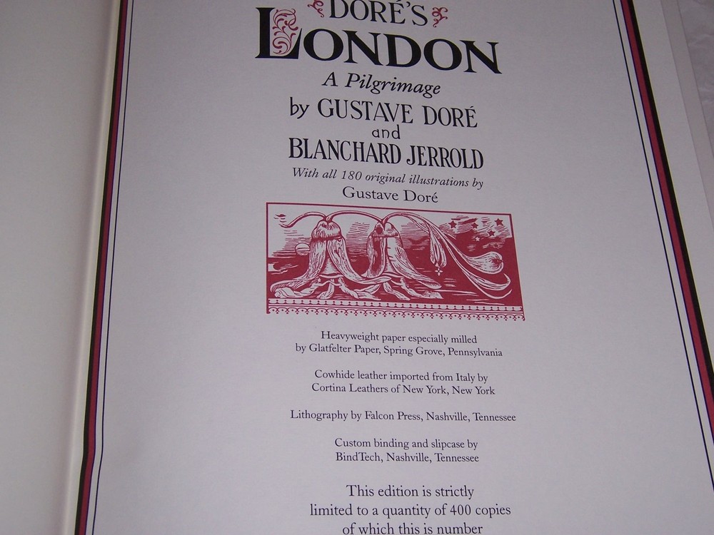 Books from Easton Press Bound in premium leathers, distinctive cover design, hubbed spine accented in 22-karat gold Endsheets of rich moire fabric, permanent satin ribbon page marker Thread sewn pages for strength and durability, gilded page edges for beauty and protection Handsome readable typefaces, beautiful illustrations, archival-quality acid-neutral paper TITLE GUSTAVE DORÉS LONDON: A PILGRIMAGE AUTHOR Gustave Doré and Blanchard Jerrold MORE DETAILS Re-creating the Historic 1872 Illustrated Edition...In 1872, legendary artist Gustave Doré and British journalist Blanchard Jerrold published an extraordinary portrait of Victorian London that lives on today as one of the most powerful illustrated books of the century and an irreplaceable historic document. From the highest society to the lowest depths, Doré's dramatic images brilliantly capture 19th century life in the first great modern metropolis. Leather-bound Deluxe Limited Edition. Limited to just 400 hand-numbered copies! All 180 illustrations by the great Gustave Doré from the historic 1872 edition. 54 full-page plates, each protected by hand-applied tissue overlays. The original cover from the 1872 edition beautifully stamped in two colors. Two-color printing throughout. A raised "hubbed" spine deeply embossed with genuine 22kt gold. Acid-neutral paper that will not crumble with age. Printed marble endsheets, Smyth-sewn pages. Measured by 11 3/4" x 14 3/4", 328pp DESCRIPTION like new condition, unread, clean inside, tight hardcover binding SHIPPING Books will be packed safely, and shipped via USPS Media Mail with tracking number.