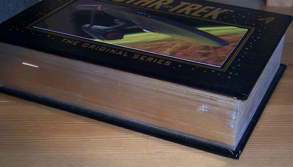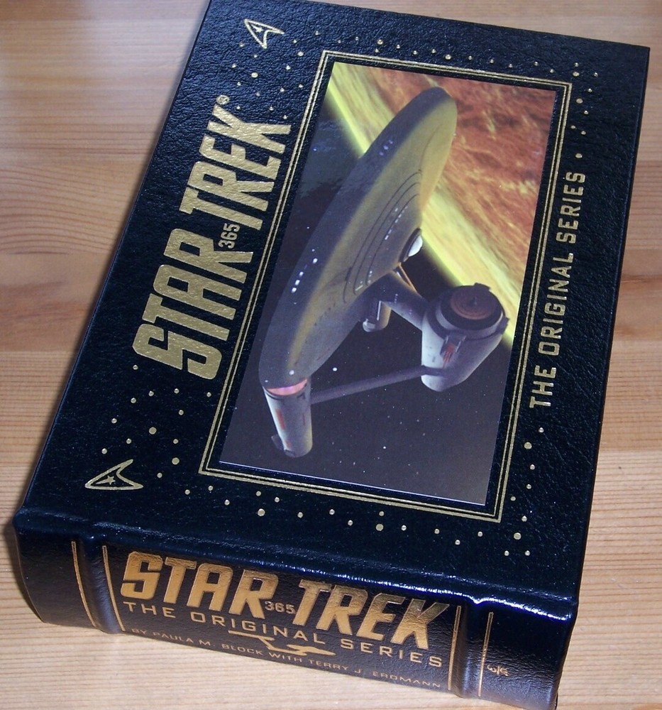 Books from Easton Press Bound in premium leathers, distinctive cover design, hubbed spine accented in 22-karat gold Endsheets of rich moire fabric, permanent satin ribbon page marker Thread sewn pages for strength and durability, gilded page edges for beauty and protection Handsome readable typefaces, beautiful illustrations, archival-quality acid-neutral paper TITLE STAR TREK 365 Original Series AUTHOR Paula M Block with Terry J Eromann MORE DETAILS Eric Klopfer (editor) with an insert patched on the front Measured by 9 1/4" x 6 1/2", 365pp. DESCRIPTION very good condition, with a few scuff marks on the bottom edge , unread, clean inside, tight hardcover binding SHIPPING Books will be packed safely, and shipped via USPS Media Mail with tracking number.