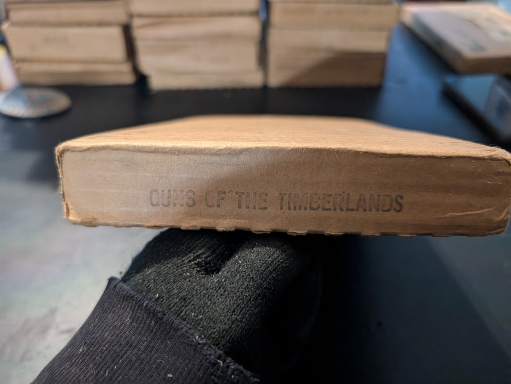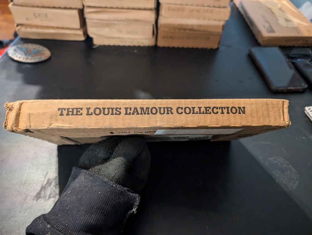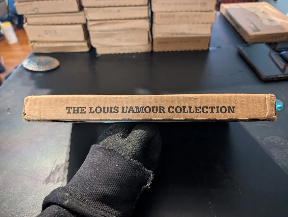selling a new in box a vintage 1980s of the Louis l'amour collection the title is guns of the timberlands it is leather bound hardcover with a gold in laid signature on the front of the book it comes in the original box it was shipped in it is a western fiction published by bantam books it was published in the 1980s in great shape from a smoke free home please look at the pics and if you have any questions please ask