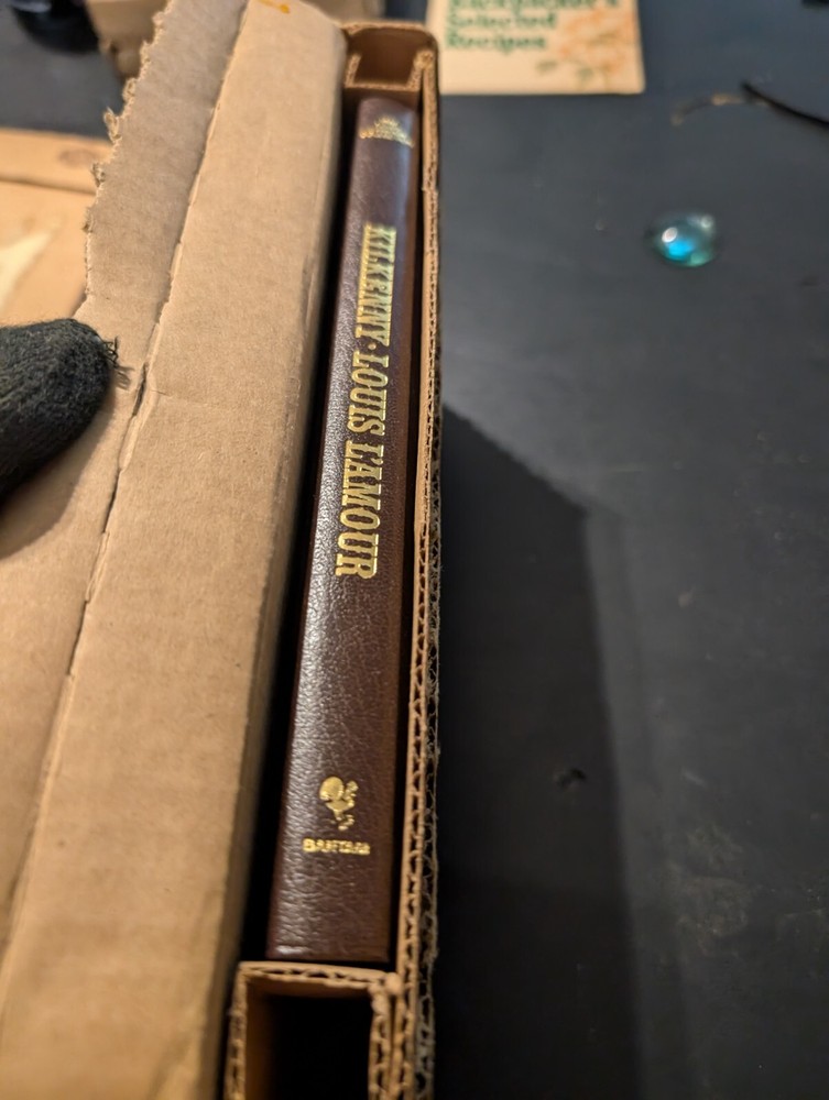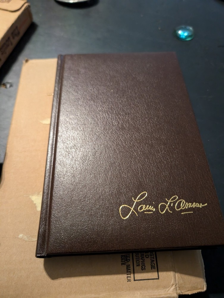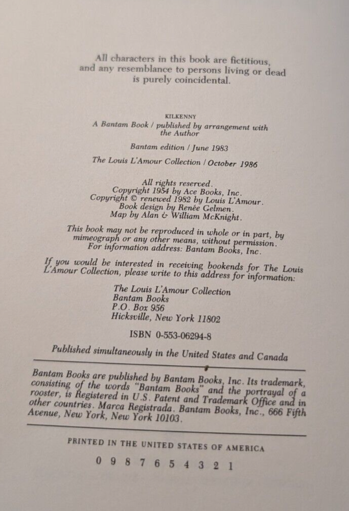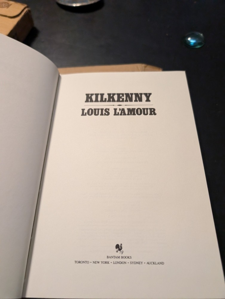 selling a very nice vintage 1980s of the Louis l'amour collection the title is kilkenny it is leather bound hardcover with a gold in laid signature on the front of the book it comes in the original box it was shipped in it is a western fiction published by bantam books it was published oct 1986 in great shape the box is opened but dose not look like is was ever read if it was it was just once please look at the pics and if you have any questions please ask