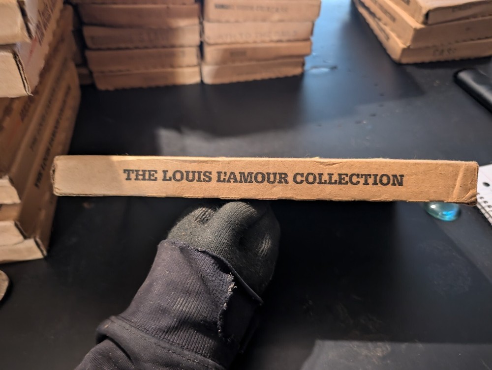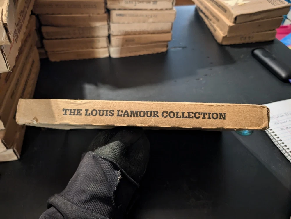 selling a new in box a vintage 1980s of the Louis l'amour collection the title is over on the dry side it is leather bound hardcover with a gold in laid signature on the front of the book it comes in the original box it was shipped in it is a western fiction published by bantam books it was published in the 1980s in great shape from a smoke free home please look at the pics and if you have any questions please ask