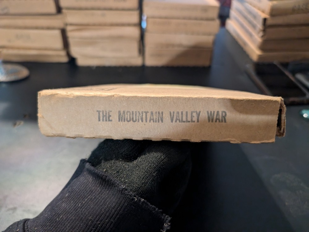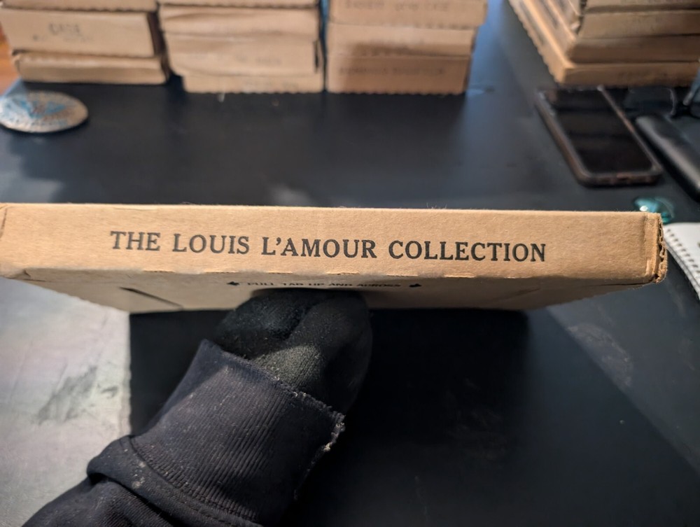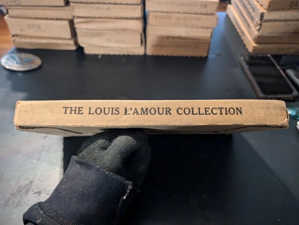 selling a new in box a vintage 1980s of the Louis l'amour collection the title is the mountain valley war it is leather bound hardcover with a gold in laid signature on the front of the book it comes in the original box it was shipped in it is a western fiction published by bantam books it was published in the 1980s in great shape from a smoke free home please look at the pics and if you have any questions please ask