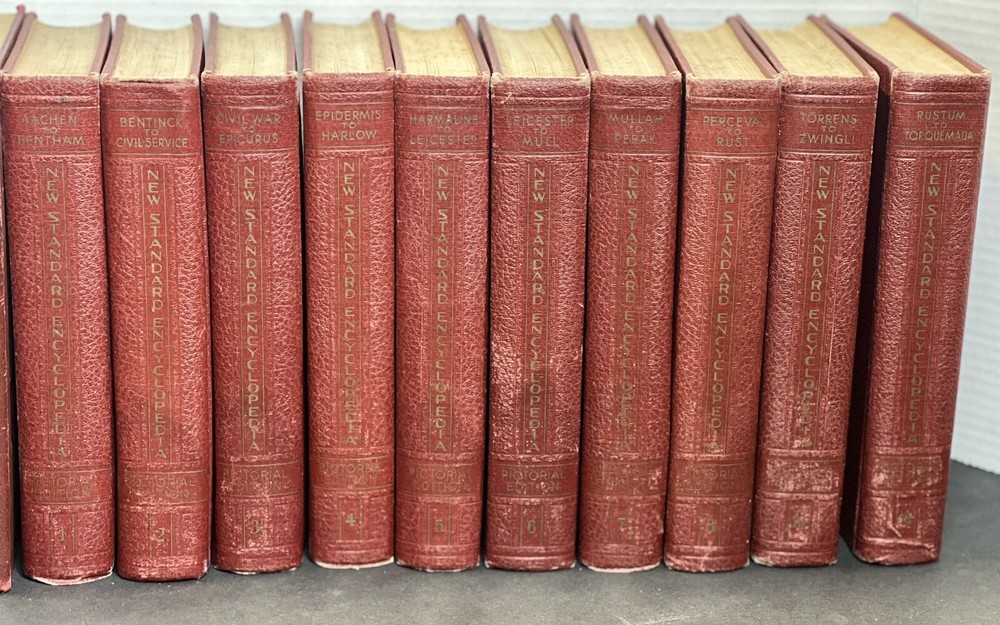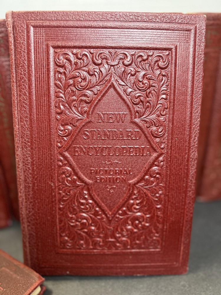 This 11-volume set of the New Standard Encyclopedia is a must-have for anyone interested in reference, cultural history, and books. The set is in vintage condition and features leather-bound covers with embossed detailing. Each book also includes beautiful illustrations and gold foil stamping. The encyclopedia set is a pictorial edition published in 1942 by the Chicago Standard Education Society. It contains 11 books with a total of 32 lbs of weight and 11 inches in length, 13 inches in width, and 17 inches in height. The set is in English and includes topics such as history, cultural history, and more. Don't miss your chance to own this amazing piece of history!